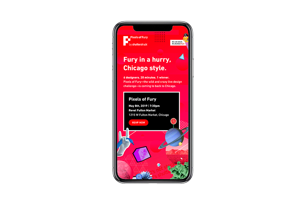 We wanted to tie in this year’s Pixels creative with Shutterstock’s new - It’s not stock. It’s Shutterstock campaign. Combining all of the expected images into a collage, we wanted to present this event in the most fun and appealing way.